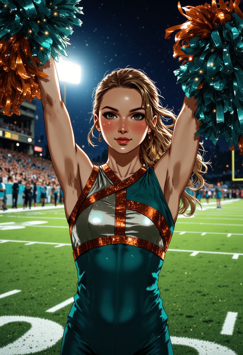 A striking close-up of a cheerleader performing thiruvikramasana pose. The shot frames her from the waist up, capturing the intensity and focus in her eyes as she executes this demanding move. Her uniform defies traditional cheerleading conventions—instead of standard school colors, she wears an avant-garde design featuring an asymmetrical metallic bodice with geometric cutouts that catch the light, paired with a single shoulder strap adorned with small LED lights that create a subtle glow effect. The uniform incorporates unexpected color combinations of deep teal and burnished copper that complement each other while standing apart from typical cheer aesthetics. In her hands, she grips oversized pom-poms that dominate the foreground—lush, full spheres of shimmering mylar strips that create a mesmerizing visual texture. Her hair is styled in an elaborate braided updo with strands of matching metallic ribbon woven throughout. The football field is visible but deliberately blurred in the background, with just enough definition to establish context while keeping all focus on her dramatic pose and unique styling. The lighting captures the precise moment of athletic perfection, highlighting the determination in her expression and the dynamic energy of the performance. It is night time and no other lights, emphasize the LED lights of her shoulder strap j_art