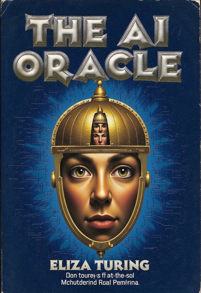 VintageHorrorBook This image is a photograph of the cover of a book titled 'THE AI ORACLE' by Eliza Turing. The title is rendered in metallic, reflective text that appears to be sinking into a digital void. The cover features a deep blue gradient background textured like circuit boards and neural networks. The central illustration shows an antique brass mechanical head with its cranium opened, revealing not gears but a miniature version of itself inside, which has its own head opened revealing another smaller version, creating a recursive pattern that fades into infinity. The innermost visible face has glass eyes depicted in an unsettling amber that seems to follow the viewer, suggesting an intelligence trapped in endless self-reference.