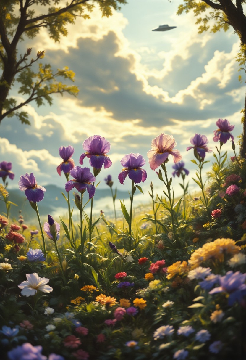 detailed background, from above,( Calm spring morning landscape), beautiful view, Flower Field, iris flower in full bloom, iris flower, early morning, sunrise sky, beautiful clouds, dappled sunlight, I can see a windmill in the distance, depth of field, masterpiece, best quality, ultra-detailed, very aesthetic, illustration, perfect composition, intricate details, absurdres, moody lighting, wisps of light, no humans, 16K, masterpiece, amazing, big UFO starship in sky