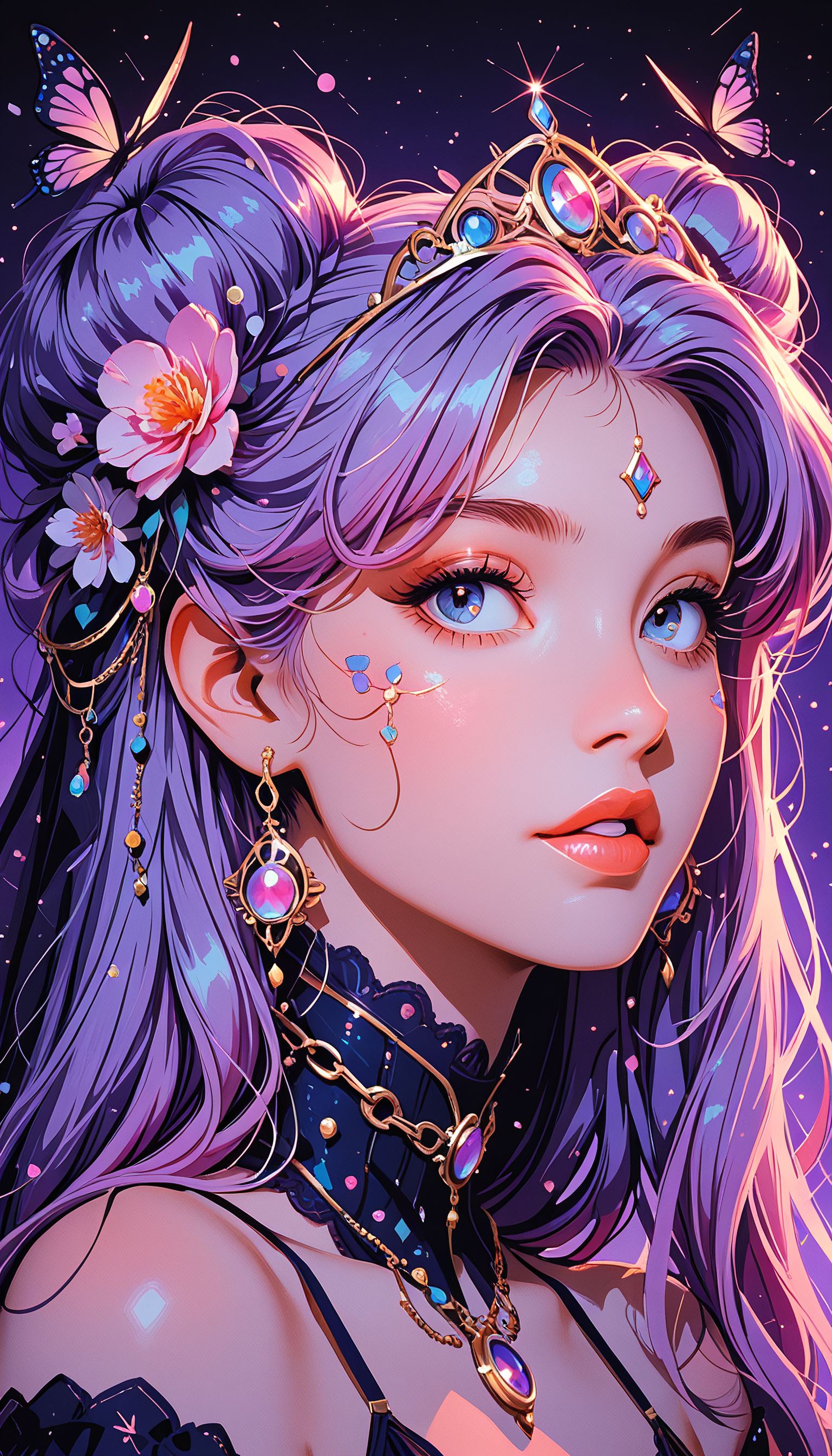 masterpiece, Shinkaistyle, pinkretroanime, retro art, Cyberpunk Style, cyberpunk, science fiction, hi tech, future tech, neon, (Cybernetics:1.25), (Neon Cityscape:1), (lineless:1.5), smooth edges, (lighten the face:1.5), tall body, slender body, fit body, long legs, The image presents a fantasy-inspired, anime-style character against a backdrop that evokes cosmic themes. The central figure is a female warrior with long purple hair tied back, suggesting a sense of motion or readiness for battle. She wears a vibrant outfit with purple and teal tones, adorned with intricate gold jewelry. A helmet covers her head, featuring detailed designs that echo the regality and power typically associated with fantasy heroes. The character's right arm is extended outward, holding what appears to be an orb of light or energy. The expression on her face is intense and focused, reflecting the concentration required in combat. A set of large blue eyes, reminiscent of a cybernetic enhancement or magical power, are prominent in her appearance. The background is dark and starry, with floating celestial bodies that add to the cosmic ambiance. The overall lighting in the image is dim yet dramatic, with cool blues contrasting against warmer tones from the character's armor and hair. This creates a moody atmosphere, enhancing the mystical feel of the scene. The view angle suggests the viewer's perspective is from the side, slightly below the character, providing a dynamic view that makes her appear larger than life. The camera angle seems to be from the front-right side, capturing the character's profile while highlighting the action in her right arm., 1girl, solo, long hair, looking at viewer, smile, open mouth, bangs, blue eyes, hair ornament, dress, ribbon, bare shoulders, jewelry, blue hair, hair ribbon, upper body, pink hair, purple hair, flower, multicolored hair, earrings, parted lips, sky, teeth, choker, shiny, hair flower, necklace, hair bun, shiny hair, collar, from side, two-tone hair, lips, gradient, looking to the side, gradient background, eyelashes, sparkle, double bun, makeup, night, chain, facial mark, expressionless, bug, tiara, crescent, black background, gem, butterfly, portrait, veil, light particles, close-up, eyeshadow, purple background, beads, purple flower, butterfly hair ornament, red lips, light, dark background, head chain