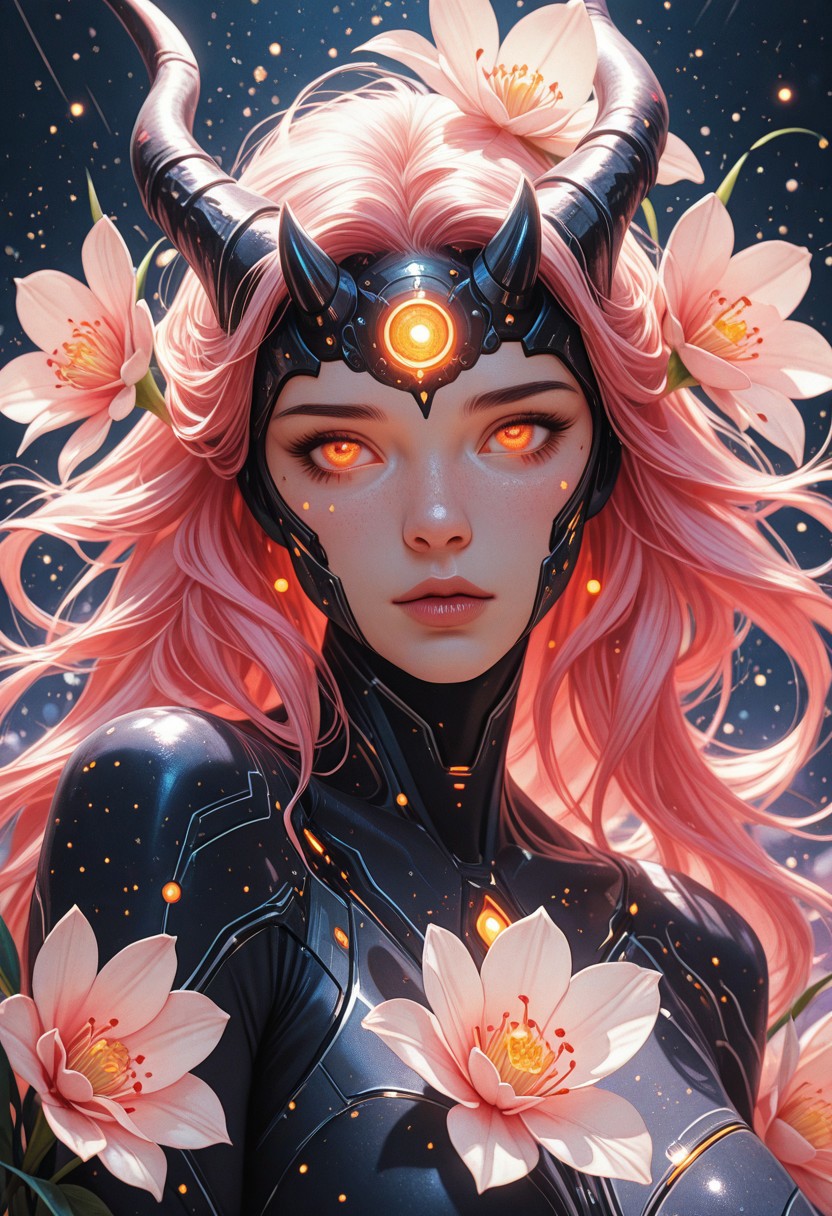 best_quality, absurdres, ultra-detailed, highly_aesthetic, highly_detailed_eyes, depth_of_field, subject_focus, 1girl, woman, beauty, magical, dynamic motion, flowers, glowing_particles, cinematic, high_angle, horn