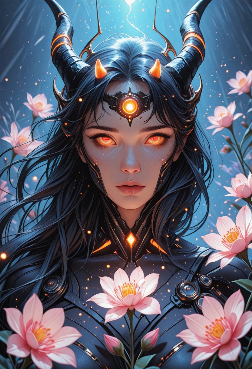 best_quality, absurdres, ultra-detailed, highly_aesthetic, highly_detailed_eyes, depth_of_field, subject_focus, 1girl, woman, beauty, magical, dynamic motion, flowers, glowing_particles, cinematic, high_angle, horn