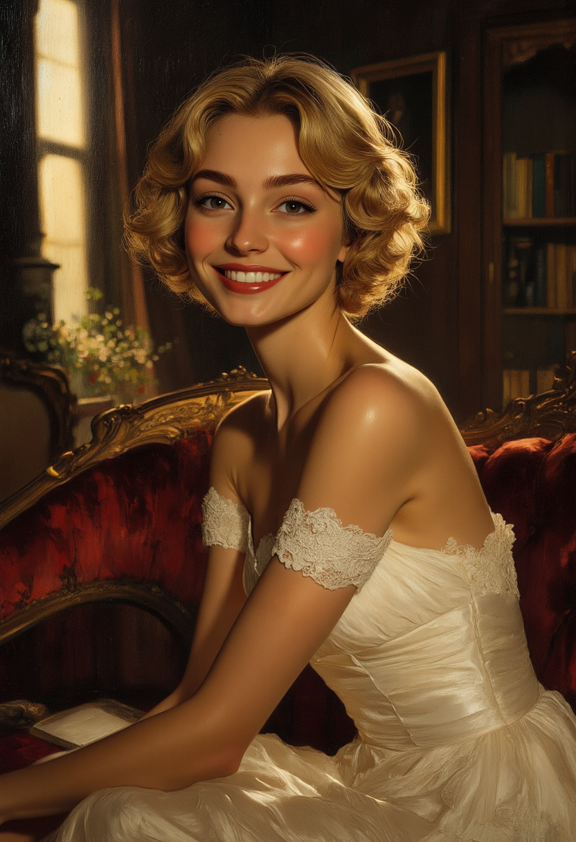 Realistic oil painting in the style of old masters. A young woman with a glowing complexion and a warm, cheerful smile. She has short, curly blonde hair in soft waves, sparkling kind eyes. Wearing an elegant, off-the-shoulder cream gown with lace trim and a fitted bodice, soft texture with a gentle sheen. She sits on a plush red velvet sofa in a richly decorated, dimly lit room with dark wood paneling and golden accents. Warm golden lighting enhances the intimacy and elegance. Background is soft and moody, evoking classic portraiture. High detail, painterly textures, serene, elegant, timeless atmosphere., <lora:Anime Art V3:0.7> <lora:aidmaMJ6.1_v0.5_3:0.6> <lora:Dever_Flux_Enhancer:0.3>