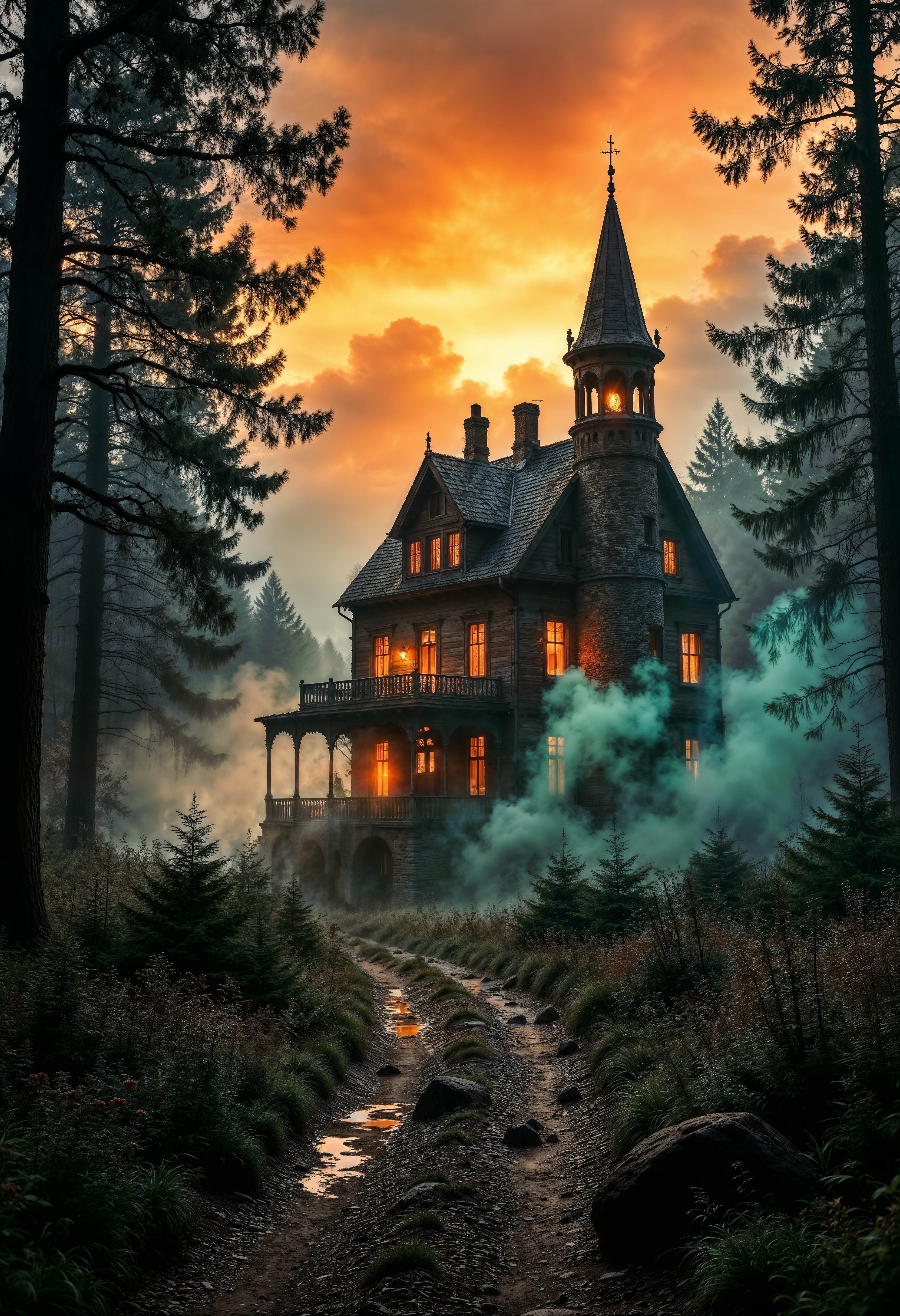 A stunning, vibrant cinematic photograph of a mysterious old castle in the mist-shrouded foothills of a mystical forest, fantasy art that evokes a sense of high-stakes drama in the style of Image's comic book photography, photo-realistic textures and film grains immerse the viewer in the scene, bathed in warm, golden light dotted with emerald greens and crimson reds, as if the forest itself were ablaze, the Ethereal clouds surround the forest, capturing the intensity of the fight for survival.