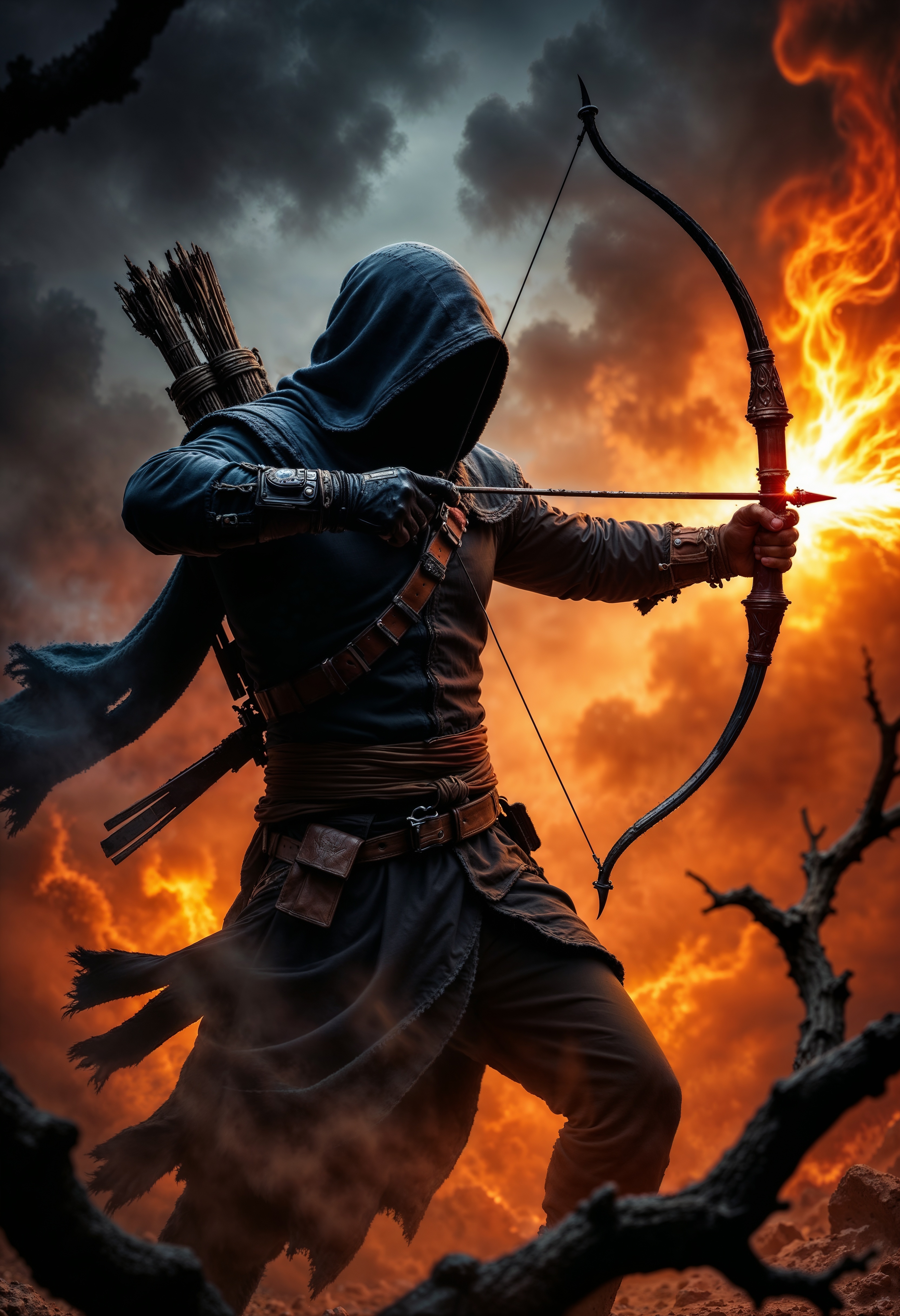 Image is a digital artwork depicting a dynamic and intense scene. The style is highly detailed and dramatic, with a focus on lighting and motion. The layout centers on a hooded archer, whose face is obscured by the hood, creating a mysterious and intense atmosphere. The archer is pulling back a bowstring, ready to release an arrow, with flames swirling around the figure, adding a sense of urgency and power. The background is dark and smoky, enhancing the fiery elements and highlighting the archer's silhouette. The color palette is dominated by warm tones of orange and yellow from the flames, contrasting with the dark, shadowy figure. The overall composition conveys a sense of action and fantasy, with a strong emphasis on the interplay between light and shadow.