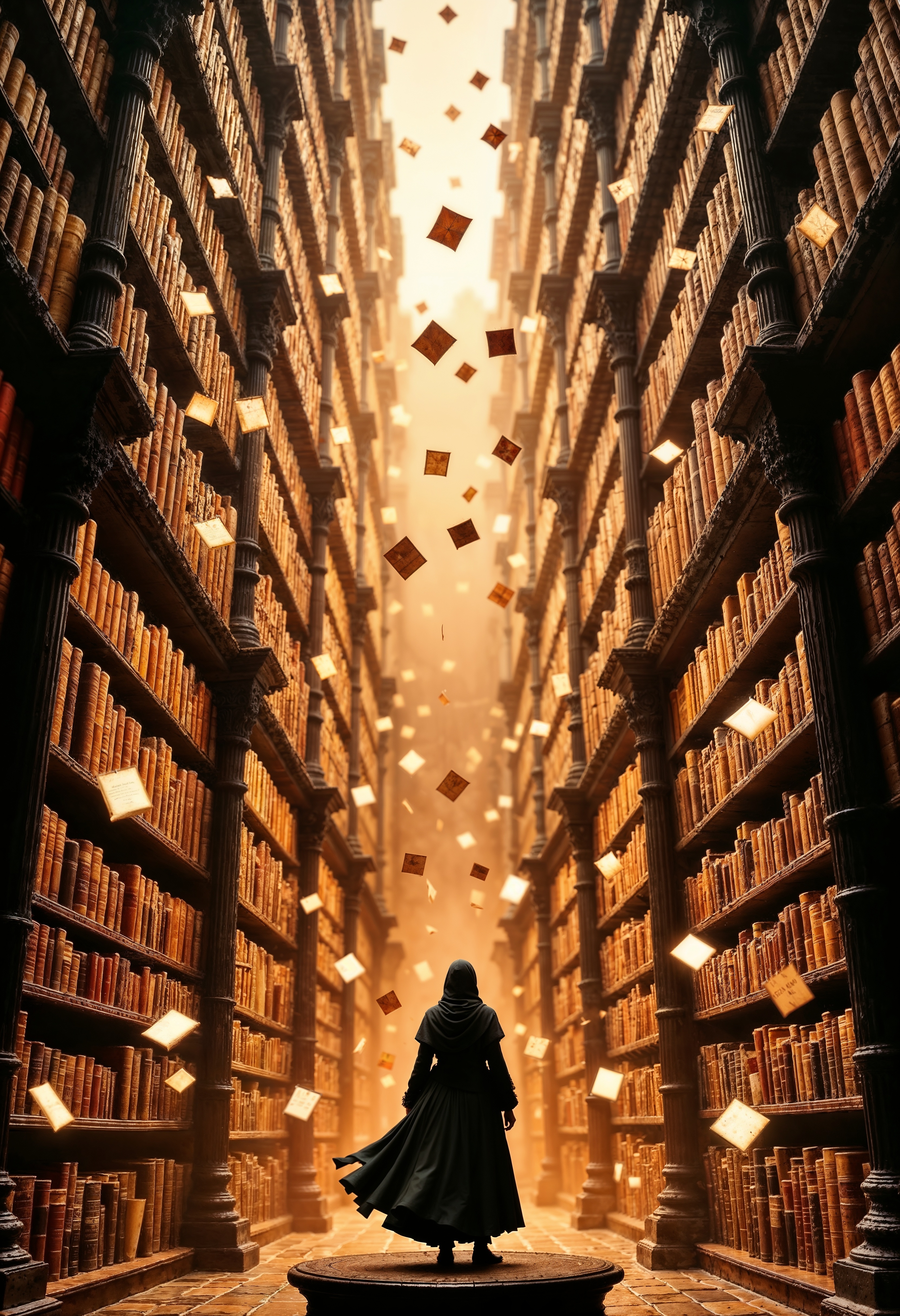 a fantastical library scene. The style is surreal and imaginative, with towering bookshelves that appear to float and extend infinitely upwards. The layout is vertical, emphasizing the height and grandeur of the library. The subject is a lone figure standing on a platform, wearing a long, flowing cloak that billows dramatically. The figure is positioned with their back to the viewer, gazing up at the towering shelves. The scene is filled with flying pages and books, adding a sense of motion and chaos. The color palette is warm, with golden and brown tones dominating, creating a mystical and ancient atmosphere. Light filters through the shelves, casting soft shadows and highlighting the dust particles in the air, enhancing the ethereal quality of the scene.