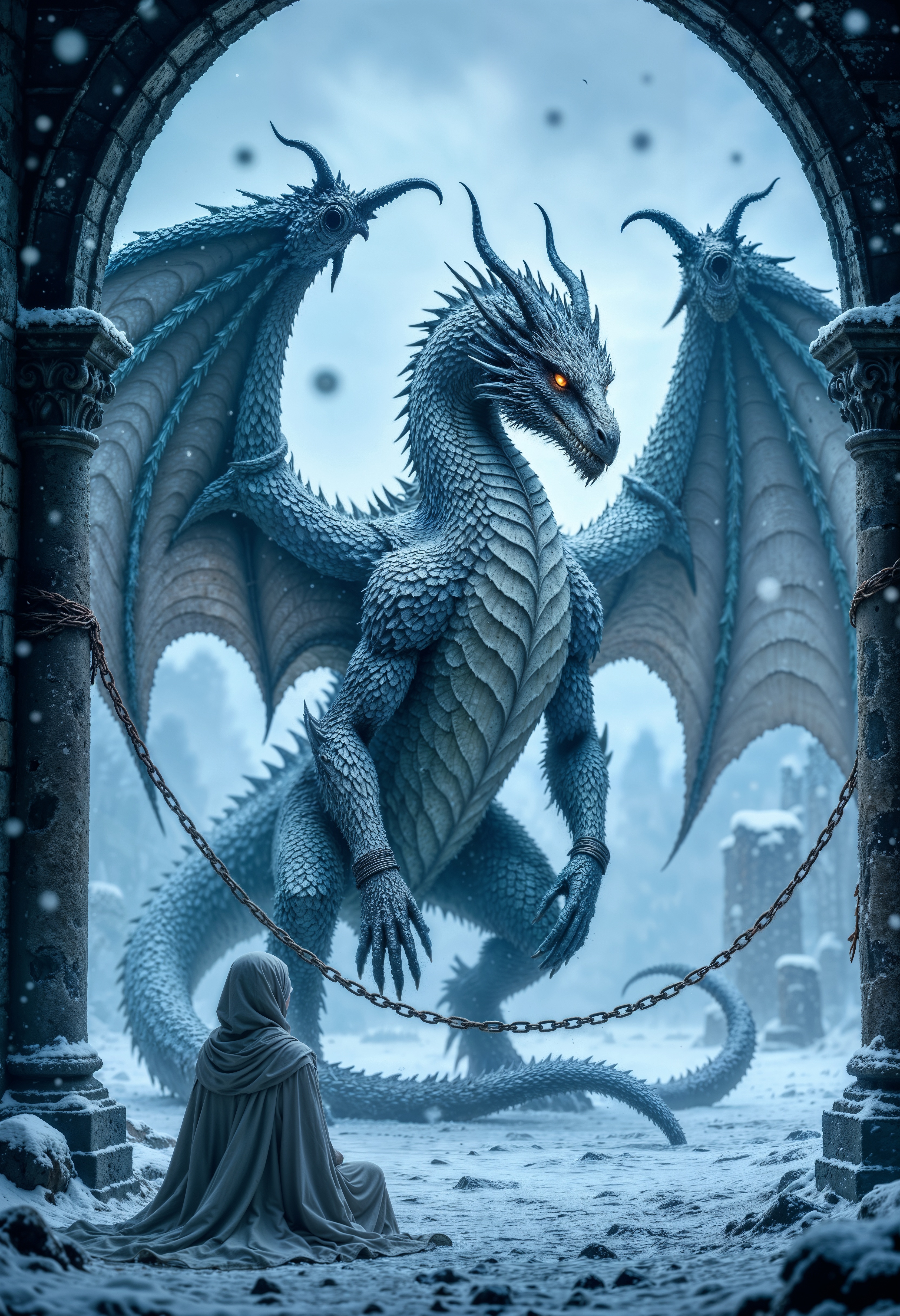 a massive ancient white dragon lying in a snowy ruin, wings torn and bound in magical chains, a kneeling girl in a white cloak before it, cold and tragic fantasy, blizzard atmosphere, blue-white icy palette, dramatic lighting, highly detailed scales and snow particles, mythical reverence