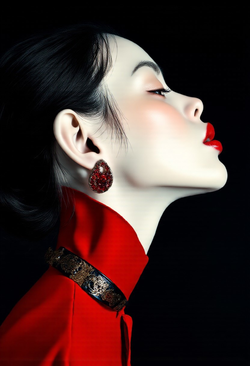 mwv7_alpha_v01,2D fashion Studio Ghibli Dark Fairytale, illustration of a woman with pale, flawless skin, her head tilted slightly upward in a confident, elegant pose. She wears bold red jewelry (earrings, necklace, and face adornments) rendered in a flat, graphic 2D style, with sharp edges and striking silhouettes. Her lips are perfectly shaped, subtly glossy, adding to the refined allure. Set against a deep black background, the composition plays with a powerful contrast of black, white, and red, creating a dramatic and stylish visual impact. Her expression is poised and emotionless, evoking high-fashion attitude. The lighting is minimal, emphasizing the silhouettes and color contrasts, with red elements glowing softly against the monochrome setting. (Editorial style) meets (minimalist elegance), capturing the essence of modern luxury with a surreal twist.