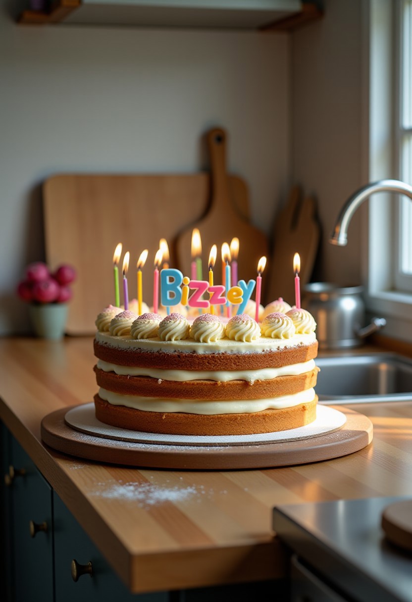 A huge birthday cute cake on a clean kitchen counter, a sign next to the cake it says "Buzz If You Need Cake!", realistic, cinematic shot,