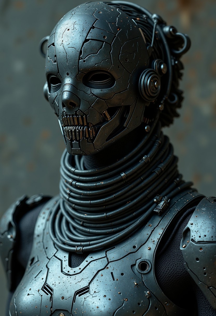 dystujo, Her mouth is partially visible, the lips tight and unforgiving, with a barely perceptible sneer that hints at the deadly prowess she possesses. The skin around her mouth is taut, as if pulled tight by the mechanical elements beneath, making her expression appear both fierce and calculating. Her neck is encircled by a collar of interlocking plates, each piece forged from dark, matte titanium, with delicate lines of glowing blue veins running through them. The collar is not just ornamental—it is a practical, chilling piece of technology, a focal point for her neural enhancements. Small, mechanical tendrils and servos extend from it, subtly adjusting her posture with every calculated breath she takes, further enhancing her deadly grace. Beneath the gleaming, nearly imperceptible mesh of chrome and circuitry that covers her upper chest, the outline of her armor is visible—angular and aggressive, like a predator’s exoskeleton. The surface of her armor is marred with deep, battle-worn scratches, the marks of countless skirmishes. Small mechanical servos and pistons are visible, embedded just beneath the surface, their functionality as seamless as the rest of her body. A faint hum can be felt from these mechanical elements, as though her body is powered by an inexhaustible, unseen source of energy.