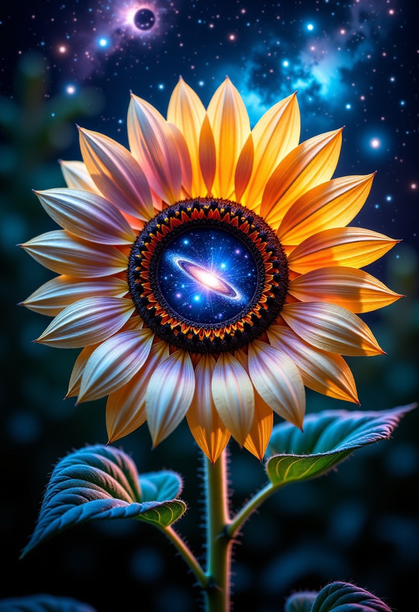 a time‑lapse scene of a sunflower turning into a galaxy, petals morphing into swirling nebulae under a midnight sky , aidmaHiDreamStyle