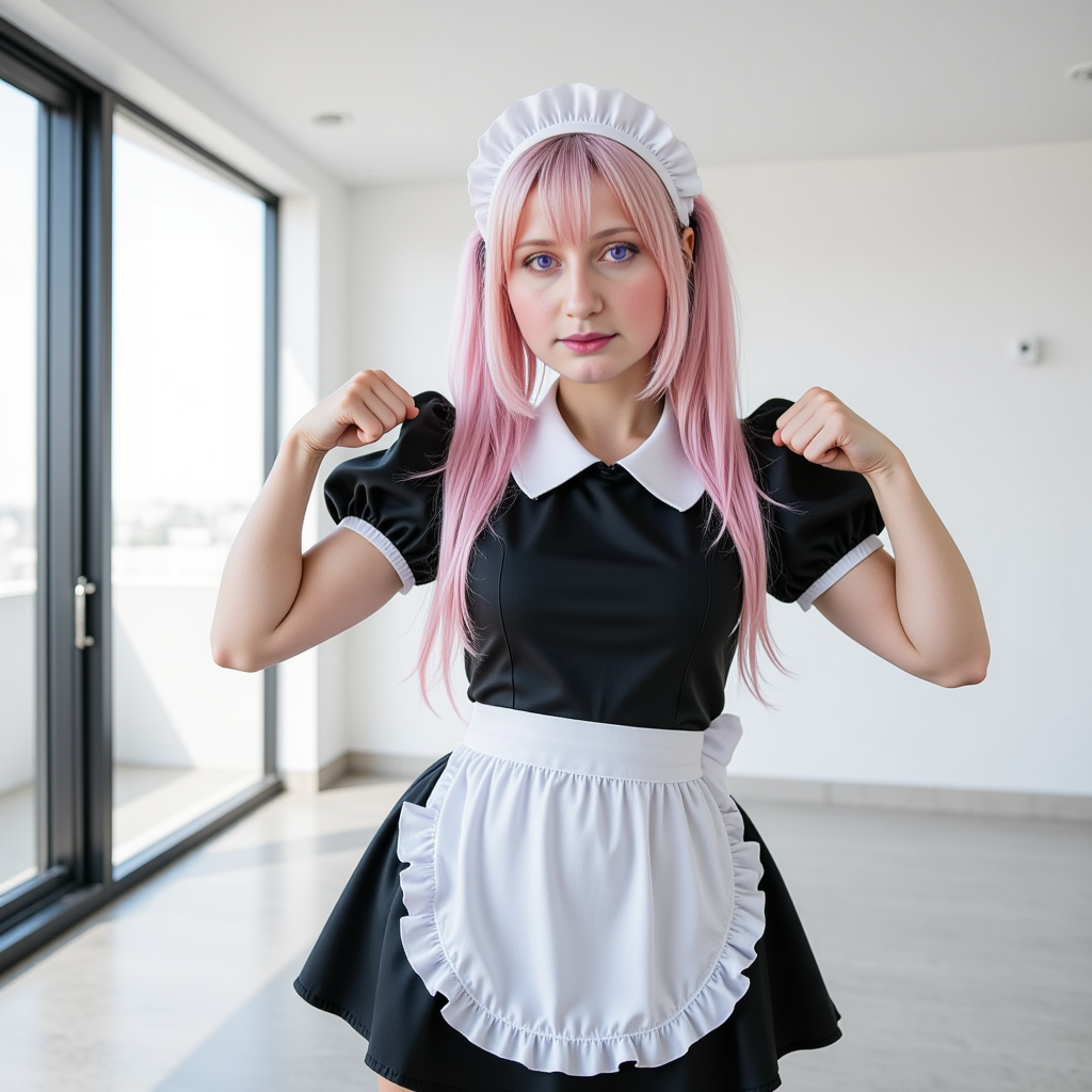 Annamaid. Masterpiece. A 22-year-old confident woman anime-style maid with pastel pink twin tails, sharp violet eyes, athletic body, medium-sized breasts. She cosplaying a French maid, standing indoors near a large window with soft natural light Her expression is determined, and she is flexing both arms in a powerful pose, symbolizing strength and cuteness at once. She wears a classic black maid dress with puff sleeves and a crisp white apron featuring ruffled edges. Her head is adorned with a frilled white maid headband. The setting is minimalistic and modern, with neutral tones emphasizing her presence. Her pose conveys a mix of playful assertiveness and anime-style charm. 8K HD, DSLR camera, high quality, detailed texture skin, high body detail, realistic, soft focus, insanely detailed, highest quality, high resolution photography, realistic photo, ultra detailed, hyperrealism