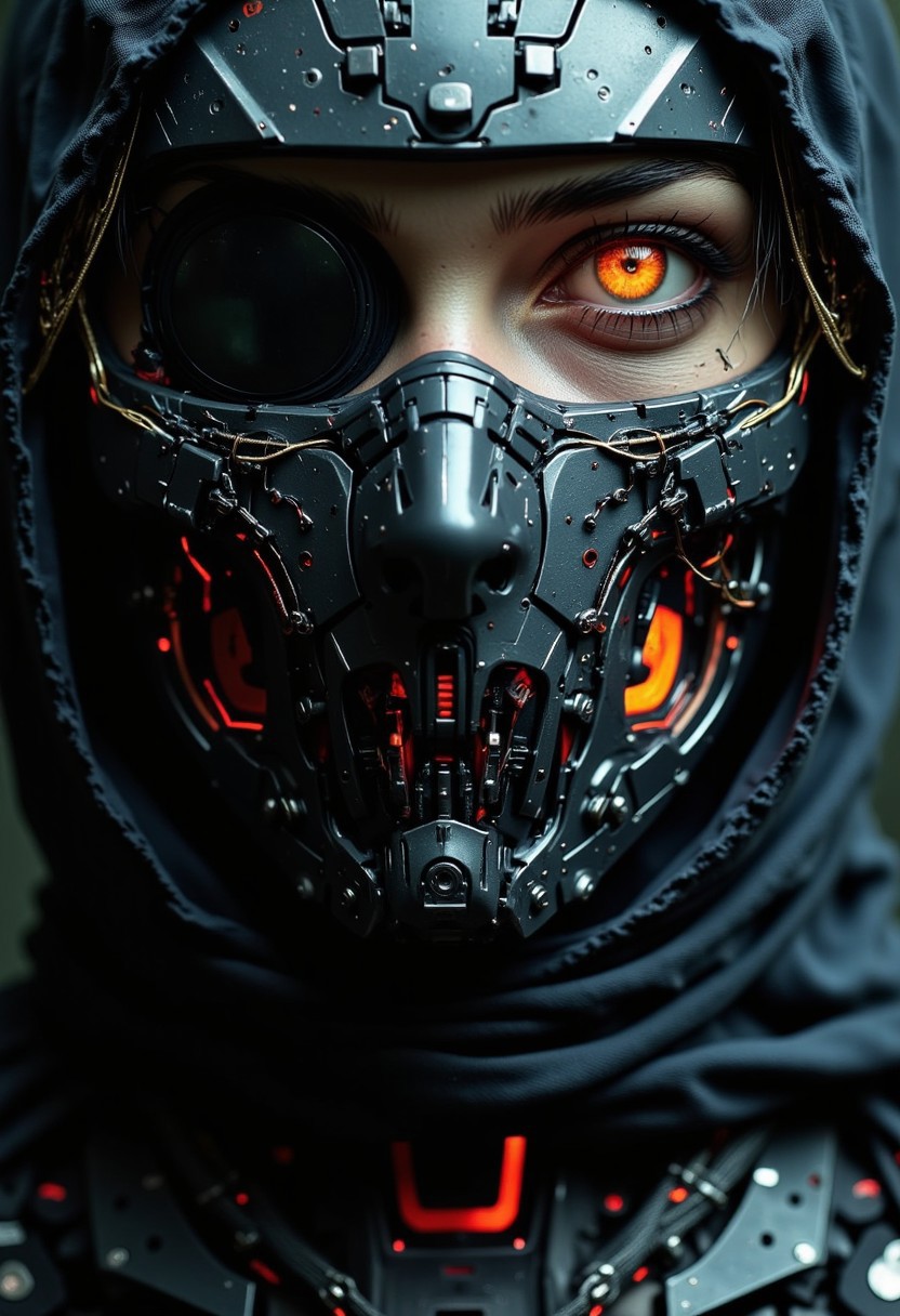 cpstyle, dystujo, The close-up reveals the terrifying face of a cyborg ninja, an intricate fusion of organic beauty and cold, mechanical perfection. Her face is framed by a sleek, polished helmet that partially covers her features, leaving only the lower half exposed. The exposed skin on her face is pale, almost ghostly, a stark contrast to the sophisticated mechanical enhancements that have replaced much of her body. Her left cheek and jawline are adorned with sharp, angular plates, seamlessly molded to her skin, their surface gleaming with a dark metallic sheen. Intricate circuit patterns snake down her neck, glowing faintly with pulses of electric energy that flicker like veins of lightning beneath the surface. The right side of her face is a chilling display of cybernetic mastery, where human flesh gives way to gleaming, polished steel and chrome. Her eye is encased in a dark, reflective visor, surrounded by a framework of sleek, geometric metal. The visor occasionally flickers with a vibrant neon orange-red glow, a direct connection to her augmented senses. The edges of the metal frame are adorned with fine micro-gears and minute, complex mechanisms that hum with energy, a silent reminder of the technological power running through her body.