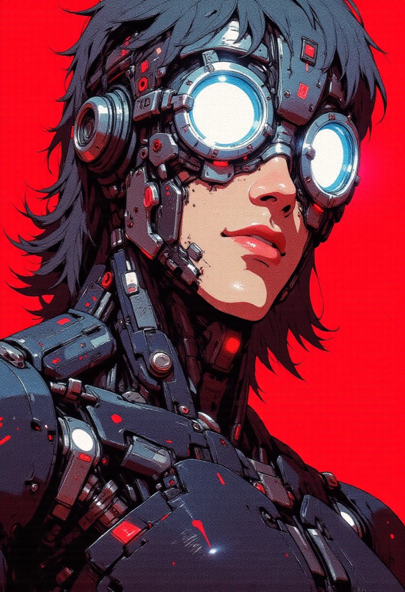 ((highly detailed, hyper realistic, graphic novel style, niji,anime, Cyberpunk, Retro, comics)) This image is a digital illustration of a young man with a clean-shaven face, depicted from the chest up. His skin is smooth with a warm, medium tone, and his expression is youthful yet intense. He has medium-length hair styled in a "two-block" hairstyle, where the sides are trimmed short, and the top is left longer and slightly tousled. The hairstyle frames his face, giving him a modern, fashionable look. He wears a sleek, futuristic helmet with a metallic finish that fits snugly over his head, with a few stray strands of his hair peeking out. His eyes are partially obscured by round, reflective goggles with a light blue tint, enhancing the mysterious and high-tech vibe of the scene. The man’s attire is dark and stylish, featuring a high-collared jacket with clean lines and subtle technological details, such as glowing accents along the seams and metallic plates, hinting at a sci-fi or cyberpunk influence. He stands in front of a rich, deep red background that contrasts sharply with the dark tones of his outfit, drawing all attention to his youthful face and the futuristic elements of his appearance. The illustration uses sharp, clean lines and bold colors, creating a striking and intense visual effect.