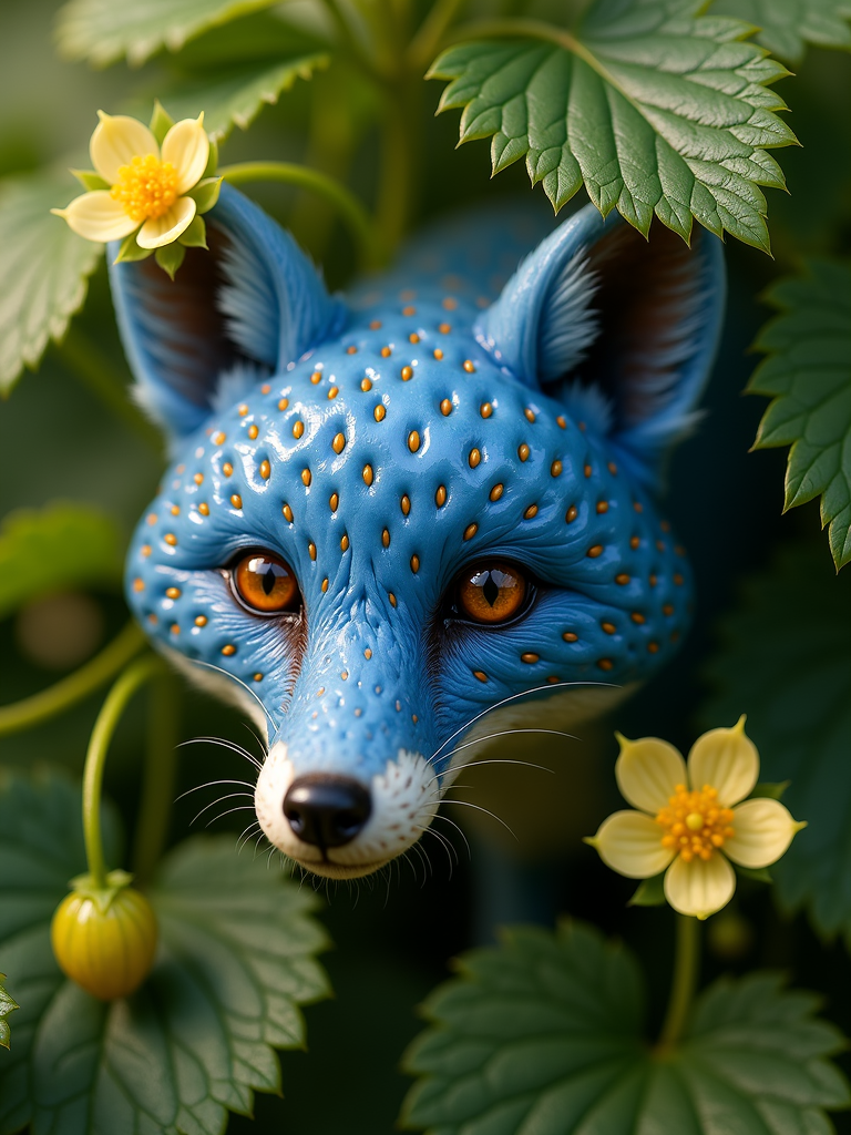 A foxâs snout peeks from under a bush composed of deep blue strawberry skin textured with glossy pale yellow seeds Its nose is matte and fleshy while moisture beads up on the upper surface of the snout under warm light <lora:FruitCore-StrawberryShift-0.3-000011:1>