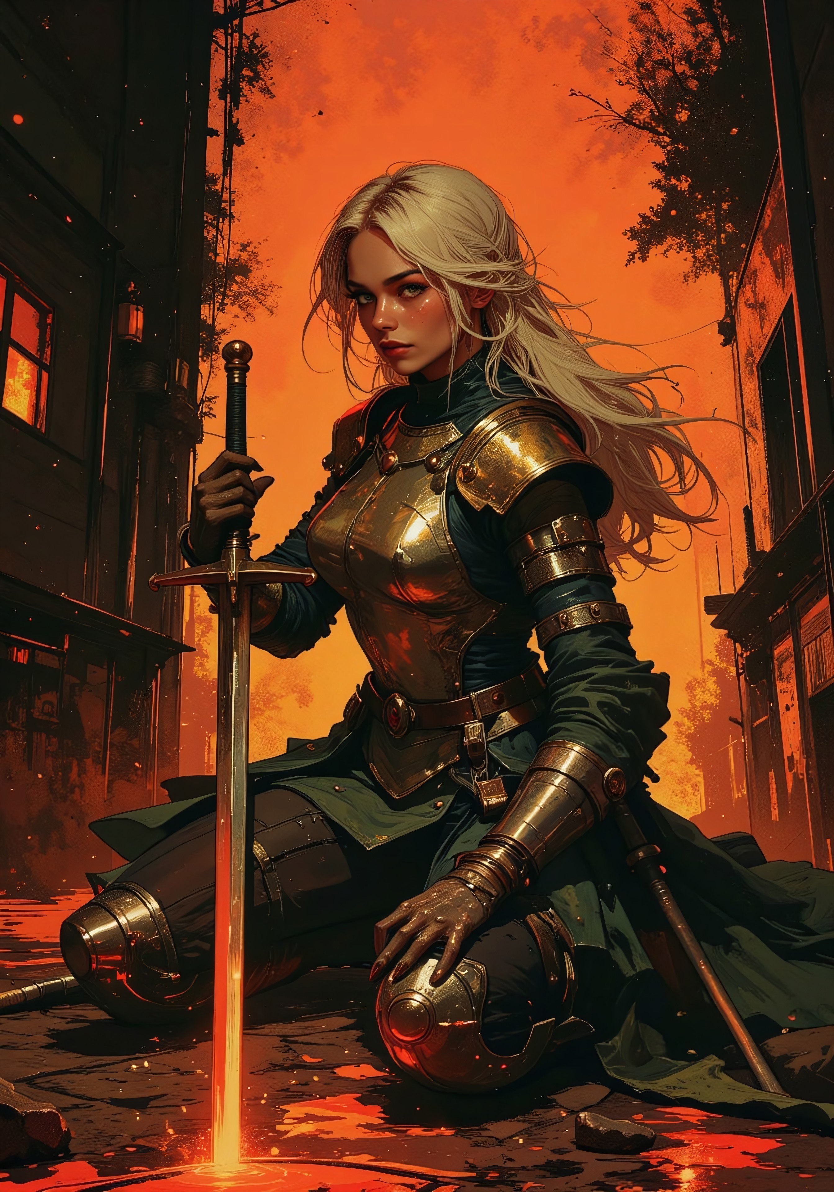A digital illustration of female knight kneeling on her claymore greatsword. She wears a richly detailed heavy medieval armor with no helmet, her long, blonde hair whirling around her. The woman gaze is hidden by her long hair, but we can see the gleam of her tears on her chin. Her skin will glow faintly, as if irradiated by a burning light beneath. The picture will have detailed lineart, a limited color palette dominated by silvers, greys and a touch of gold. The scene will evoke a sense of sadness and loss, with a dramatic light from above and deep crimson shadows engulfing the knight.