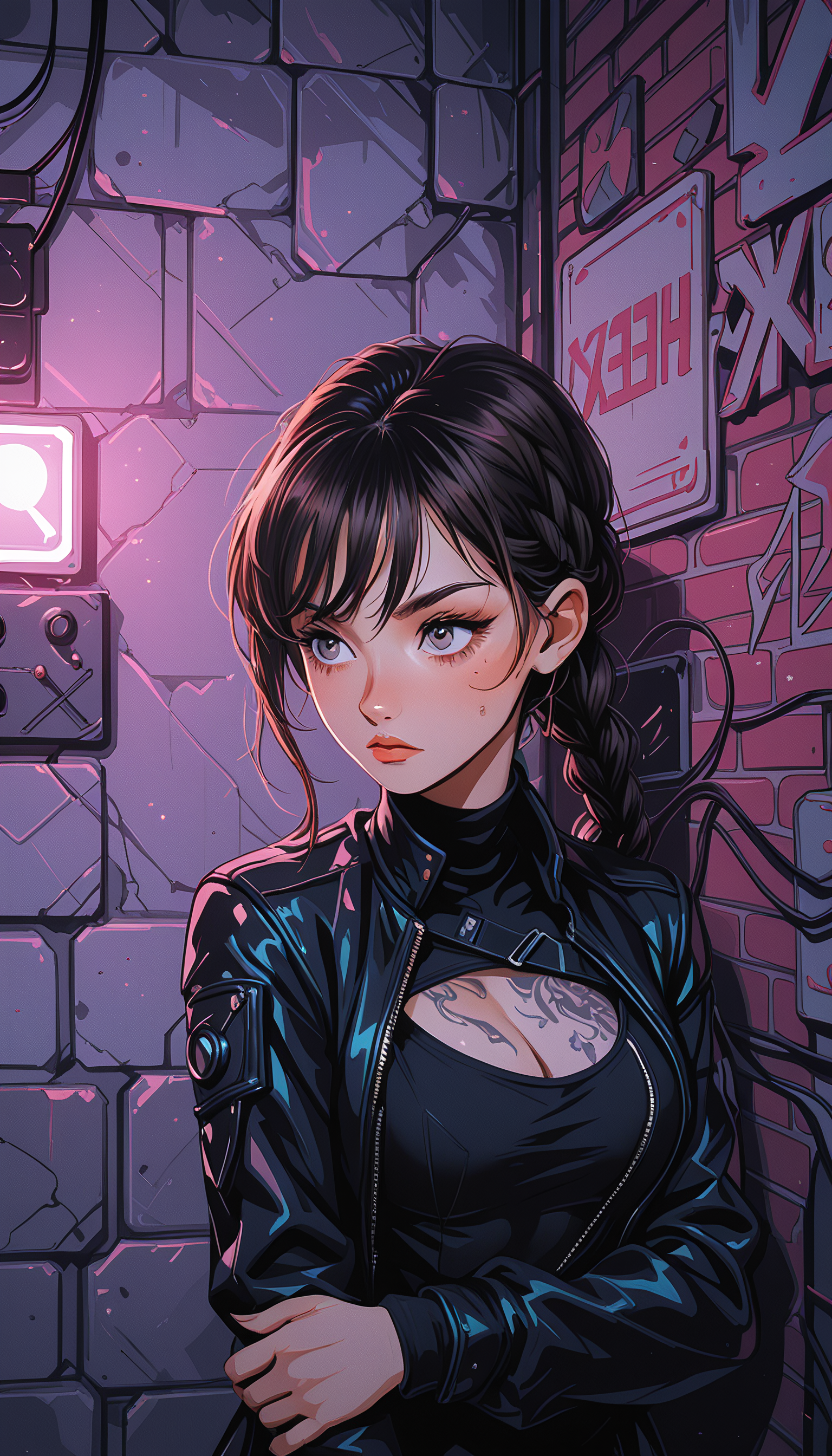 masterpiece, Shinkaistyle, pinkretroanime, retro art, Cyberpunk Style, cyberpunk, science fiction, hi tech, future tech, neon, (Cybernetics:1.25), (Neon Cityscape:1), (lineless:1.5), smooth edges, (lighten the face:1.5), tall body, slender body, fit body, long legs, The image presents a captivating scene featuring a young woman standing in an alleyway. She's dressed in a black leather jacket with a high collar, revealing the lower half of her face adorned with a nose piercing and tattoos that add to her edgy style. Her eyes are hidden from view by a pair of sunglasses she wears confidently. The woman has short hair dyed in vibrant shades of blue and purple. She's positioned centrally in the frame, leaning against the wall with her arms crossed over her chest. Her gaze is directed off to the side, giving an impression of contemplation or perhaps observing something out of frame. The lighting casts a soft glow on her face, hinting at the presence of a light source from the upper right quadrant. The alley itself has a gritty charm with its brick walls and concrete floor. Graffiti can be seen sporadically on the wall behind her, adding to the urban feel of the scene. The perspective is from an angle that places the viewer slightly below the subject, looking up at her. This angle emphasizes her height and stance in the alleyway. Overall, the image captures a moment of quiet intensity with its composition and the character's attire and demeanor., 1girl, solo, long hair, breasts, looking at viewer, blush, bangs, blue eyes, large breasts, brown hair, shirt, black hair, long sleeves, cleavage, medium breasts, closed mouth, standing, jacket, upper body, braid, sweat, parted lips, open clothes, shiny, sweatdrop, mole, twin braids, open jacket, lips, black jacket, looking to the side, grey eyes, black shirt, clothing cutout, eyelashes, mole under eye, single braid, bodysuit, tattoo, shadow, frown, scar, cleavage cutout, zipper, braided ponytail, black bodysuit, against wall, wall, leather, brick wall, chest tattoo, leather jacket, holding own arm, breast tattoo, cyberpunk, graffiti, alley