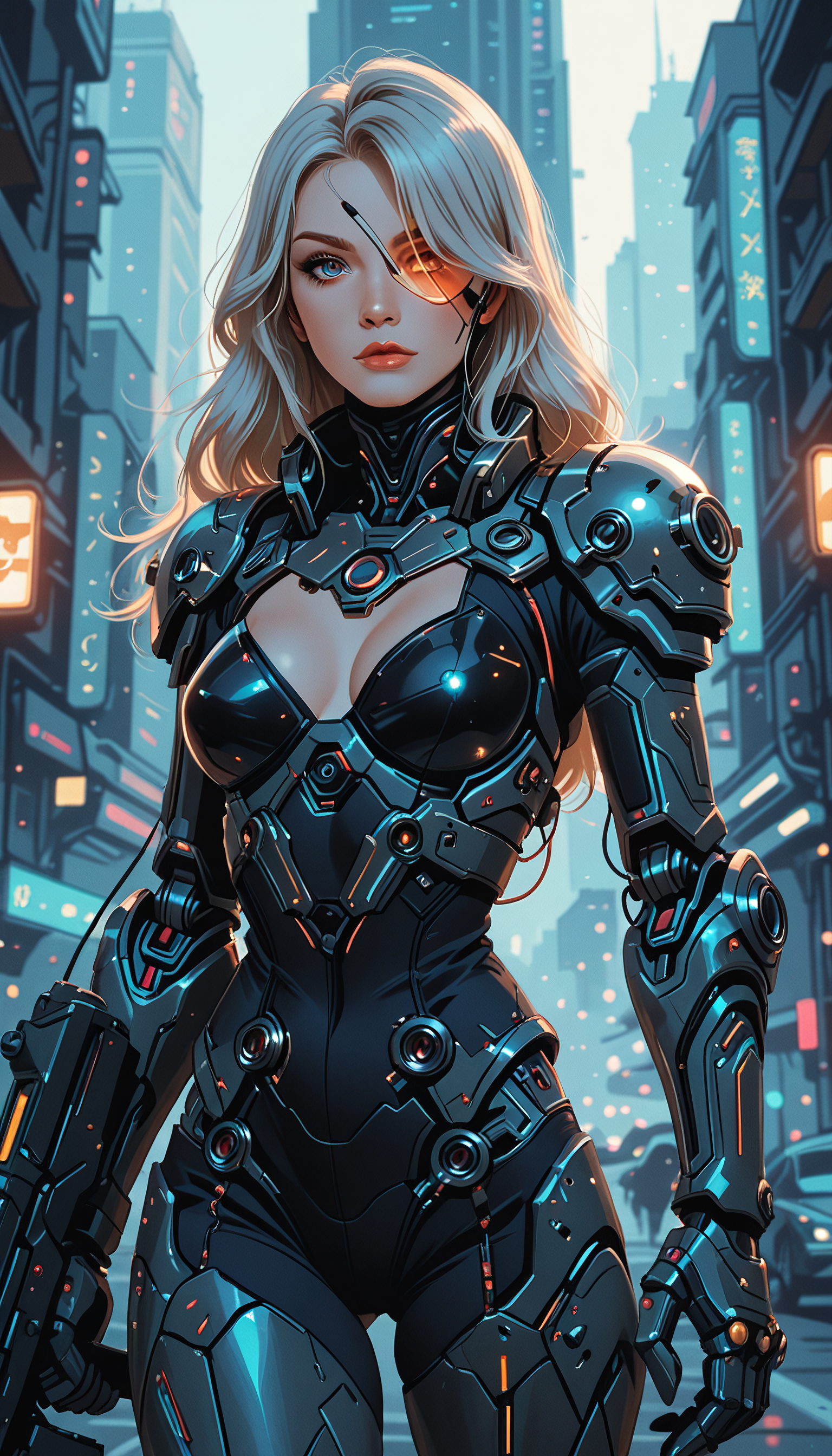 masterpiece, Shinkaistyle, pinkretroanime, retro art, Cyberpunk Style, cyberpunk, science fiction, hi tech, future tech, neon, (Cybernetics:1.25), (Neon Cityscape:1), (lineless:1.5), smooth edges, tall body, slender body, fit body, long legs, In the heart of a bustling city that seems to have leapt straight from a futuristic sci-fi movie, a female warrior stands tall amidst towering neon signs and the hustle of hovering vehicles. Her attire is a blend of advanced technology and sleek design, with her armor gleaming under the urban lights. The armor, primarily in shades of black and silver, is adorned with intricate circuit patterns that hint at its high-tech capabilities. A large visor obscures her eyes, adding an air of mystery to her persona. The warrior's stance suggests readiness, her body language mirroring the energy of the city around her. Her weapon, a massive gun with futuristic designs, is held securely at her side. The vibrant glow from the neon signs and the myriad lights of the cityscape bathe her in a soft, ambient light that highlights her as the central figure in this metropolis of tomorrow. The backdrop of the image reveals a city that is futuristic yet gritty, with towering buildings sporting holographic advertisements and flying vehicles, all under the watchful eye of advanced security drones. The overall atmosphere of the image is one of anticipation and readiness, capturing a moment frozen in time as this warrior stands guard over her city's night-lit streets., 1girl, solo, long hair, breasts, looking at viewer, bangs, blue eyes, gloves, holding, cleavage, brown eyes, medium breasts, closed mouth, green eyes, standing, weapon, white hair, small breasts, outdoors, holding weapon, armor, hair over one eye, blurry, lips, gun, grey eyes, clothing cutout, bodysuit, tattoo, makeup, depth of field, blurry background, expressionless, cleavage cutout, shoulder armor, gauntlets, holding gun, skin tight, rifle, eyeshadow, freckles, science fiction, pauldrons, one eye covered, realistic, nose, arms at sides, black bodysuit, red lips, assault rifle, mecha musume, cable, mechanical arms, cyborg, robot joints, barcode, power armor, bullpup, cyberpunk, power suit